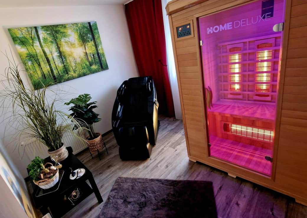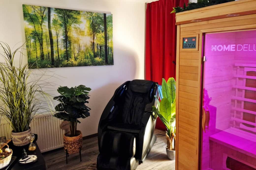 Ruheraum: Sauna, Massagesessel für Momente der Entspannung und Erholung.