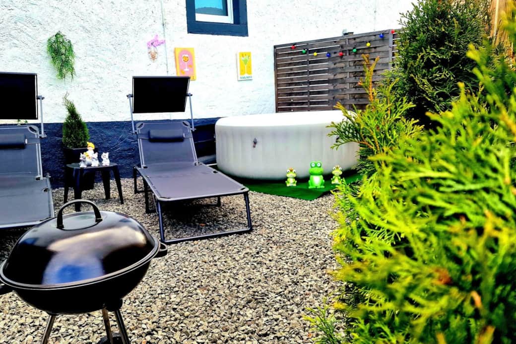 Hof und Garten: Jacuzzi, Grünfläche, perfekt zum Entspannen oder Verweilen im Freien.