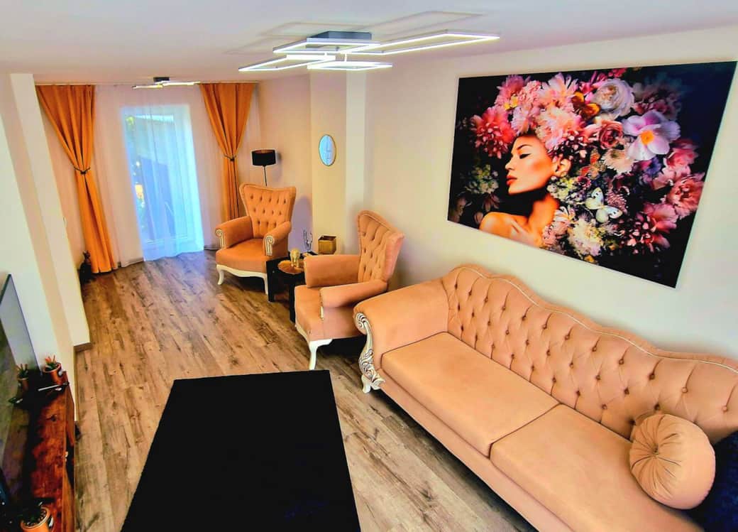 Wohnzimmer: Ein einladender Raum mit Sofa und Fernseher, perfekt zum Entspannen.